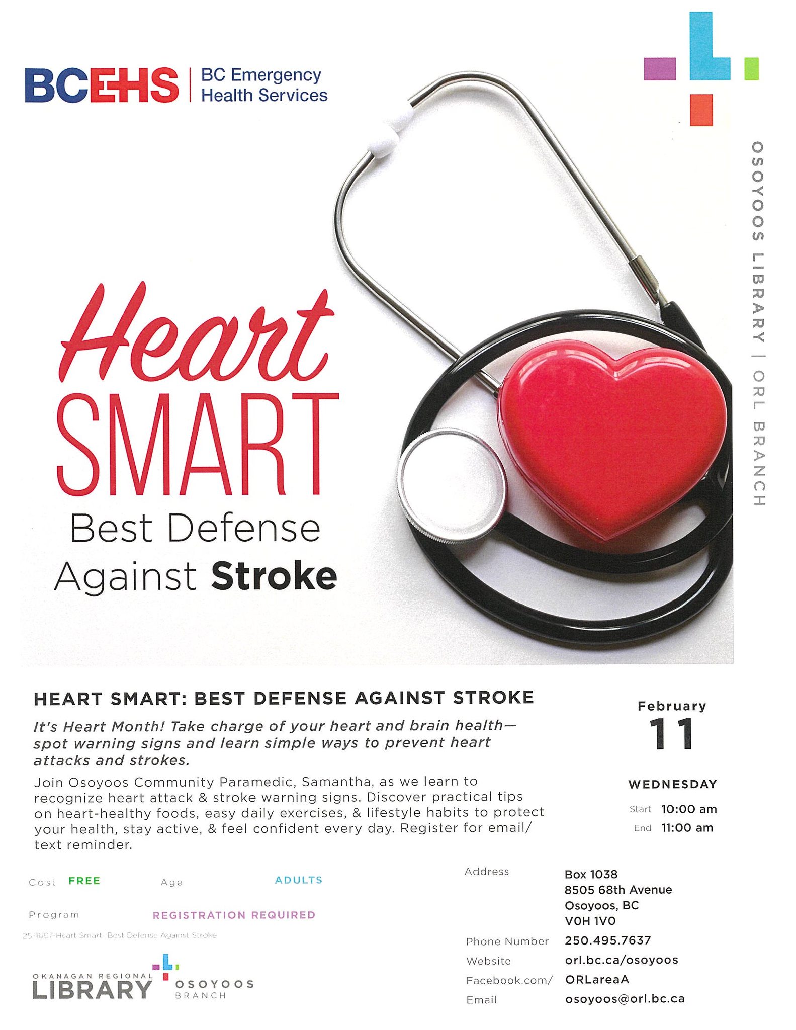 Join us on Wed. Feb. 11 @ 10am in the Osoyoos Library for a free & informative talk on taking charge of your heart & brain health.