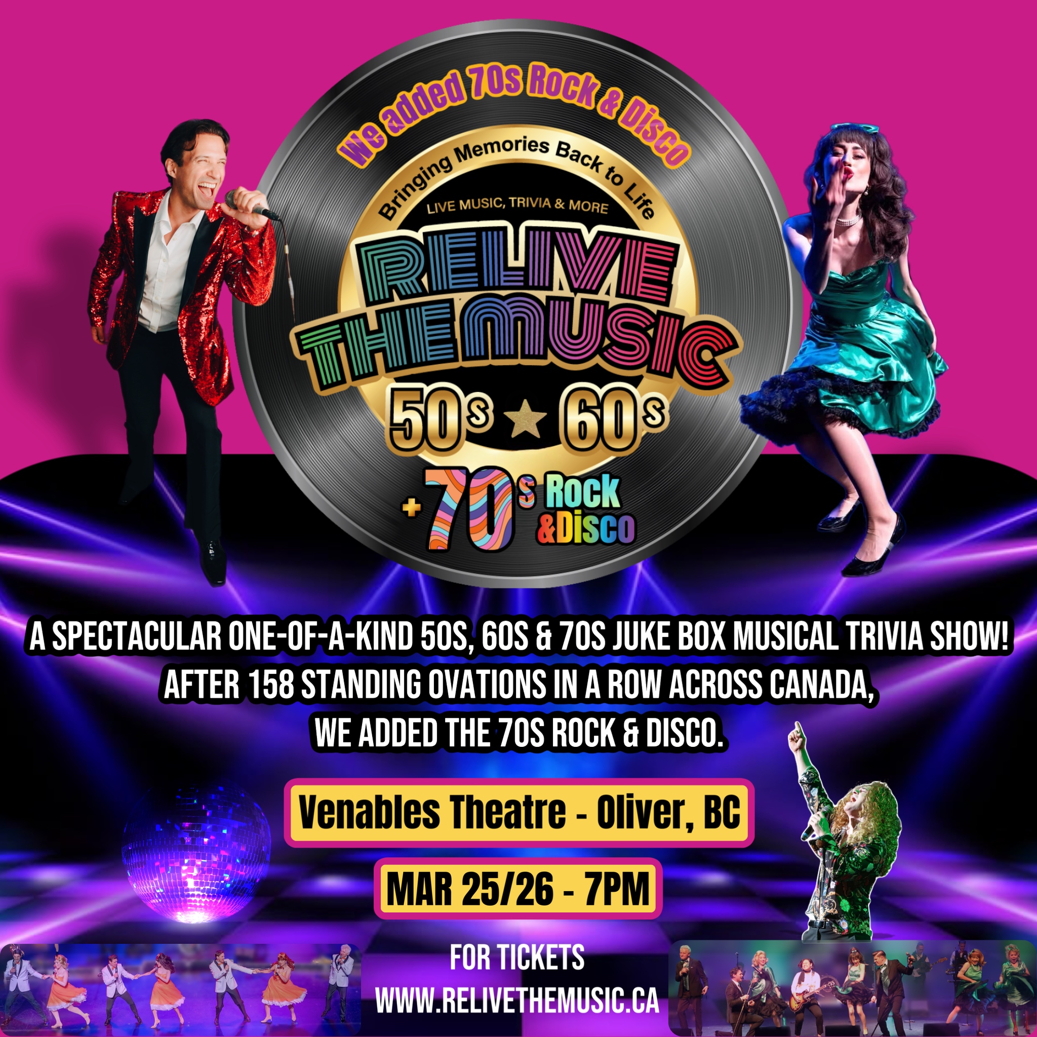 Back by popular demand – Relive the Music 50s & 60s SHOW is back after 158 standing ovations in a row across Canada with a new twist. We are keeping the biggest hits from the 50s & 60s, then adding 70s – Rock & Disco Music to our craziness. Abba, Bee Gees, Freddie Mercury, Meat Loaf, Eagles, Led Zeppelin, Earth, Wind & Fire, Donna Summer and many more