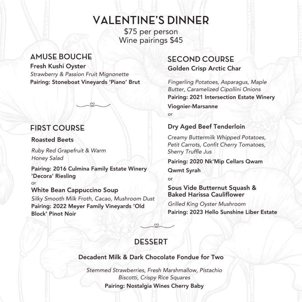 Join us this Valentine’s Day for a four-course tasting menu crafted to celebrate the season of love. Every course features thoughtful, shareable items designed to create a memorable evening for you and your date.